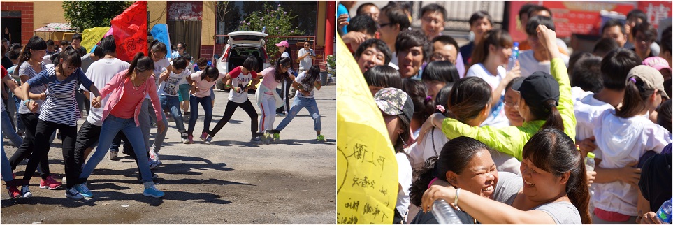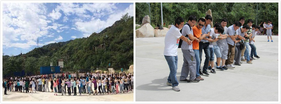 要说这次拓展,前一天都是热身,第二天才是真正的考验,拓展师把所有人按纪念手环的颜色分成四个营,每营又分成三队。大家起队名,喊口号,唱队歌。山鹰队,雄鹰队,希望之星队,必胜队,小苹果队........烈日炎炎,大家一上午活动在大太阳底下,无人理会。每个队都在一心训练着,困难重重,大家在磨合找解决办法,努力寻找以最佳的方式最快的速度达成目标。毫无偏见的帮助队里的弱者,及时替补其中的短板,彼此踩到对方也是忍痛训练,不为所动。每队给拓展师进行完五项任务的汇报演出后就进入了最终的挑战赛训练,十二支队进行终极大PK,大家卖力的喊着,“一二!一二!山鹰!山鹰!”......时至中午,终极赛“蛟龙出世”进入比赛状态,一声哨响,一道道人墙整齐划一的向前冲去,没有一支队出现插曲,队与队之间也只有微小差距,这都是大家刻苦练习的成果,最后首先冲过终点的是希望之星队!所谓一人得道鸡犬升天,绿营的另两个队也一并上台领受大奖,群臣作揖称颂“主公英明!”,只见绿营队员手一挥,慷慨道“平身”!(貌似朝代不对应,随他去吧...)着实至高无上的荣誉!众人说笑着有序的奔向大堂赴宴.......