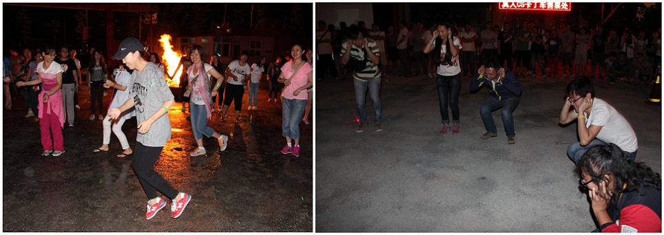 晚上的篝火晚会更是神奇而难忘,露天的KTV让爱唱歌的小伙伴一展歌喉,天地之间的舞池里渐渐骚动了起来,小朋友也融入到大家的圈圈舞中来,跟着节奏一拍也不落,更是给我们平添了一种开心与力量。随后的击鼓传花选出来的更有看点,最后胜出的冠军是要奖励30个深蹲起!还好拓展师说是开玩笑,要不那两个同仁肠子都悔青了。接下来神奇的事情就发生了!当拓展师选出几个领舞正带领全场high起来的时候,豆大的雨点以迅雷不及掩耳之势降临,大家又玩儿了一把快闪,顷刻偌大的场地只剩火堆还在忘情跳动。几分钟过后雨势渐小,又可以愉快的玩耍了,我们又纷纷出巢,领舞再次上场,音乐响起,大家开始舞蹈,一分钟未过半,大雨再次从天而降,众人瞬间又躲进屋檐。约莫十几分钟,雨再次变小,拓展师也放出豪言“我就不信这个邪,凯普林的伙伴继续游戏!”。此时,小伙伴反而被多情雨撩拨开了,全都放开了要进行到底,欢笑继续......三分钟过后,我的天哪,大雨如注......众人大笑,Tom也调侃到“以后祈雨不用找别人,找凯普林就行了,哈哈哈哈”,随后就传出他那爽朗的笑声...... 多情的雨啊,你是想跟我们一起玩耍吗,可是你知道你的热情相拥,反而让我们无法靠近,只能远观啊!最终这场“战斗”还是我们屈服于自然,大家改了阵地,回房间玩儿扑克,经典的双升,杀人游戏纷纷开场......