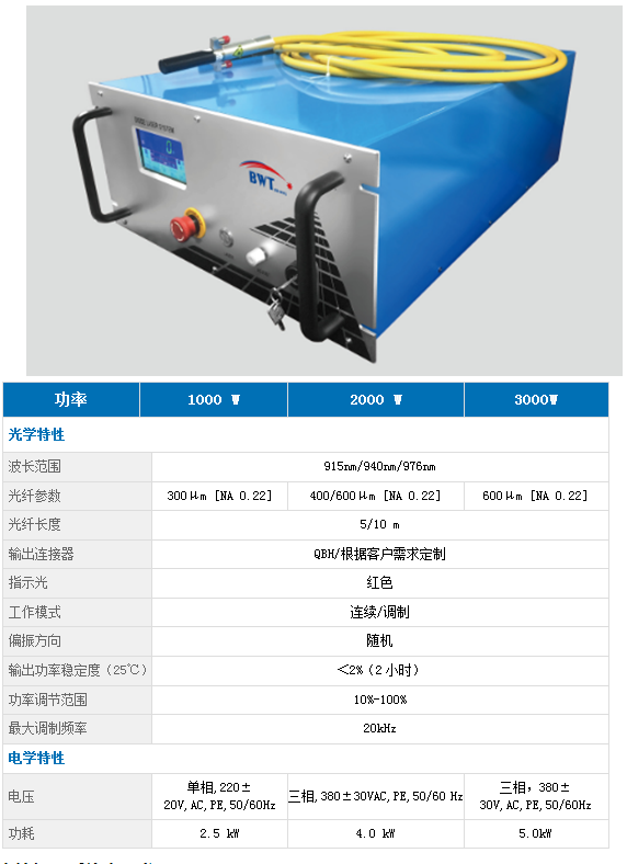 该款KW级产品,基于我司新平台开发的多单管耦合技术,采用空间合束、偏振合束、光纤合束的组合方案,实现300μm输出1000W,600μm输出3000W的功率,内部集成指示光,采用QBH输出,可与商用镜头匹配。配备完善的驱动控制系统,并且具有人性化的操控性能。光束呈平顶分布、光束能量分布均匀,适用于熔覆、钎焊以及表面热处理等应用。