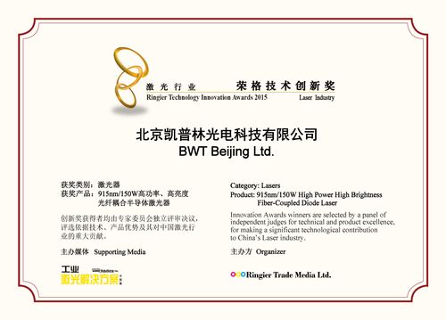 北京凯普林光电高亮度光纤耦合半导体激光器荣获2015荣格技术创新奖