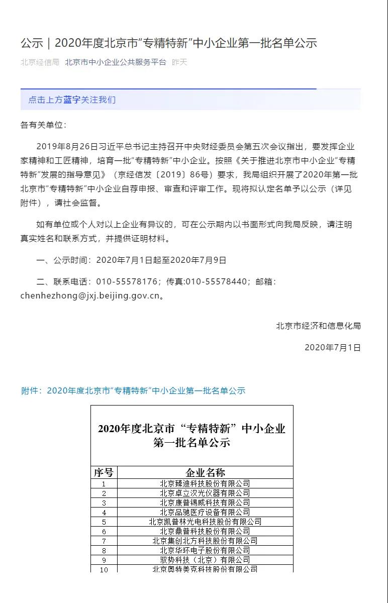 北京凯普林光电科技股份有限公司(以下简称“凯普林光电”)凭借专业化、精细化、特色化、新颖化四大优势,继2019年第一批通过全国专精特新"小巨人"企业,北京市仅有5家。本次又顺利通过北京市"专精特新"企业评选,进入公示阶段。