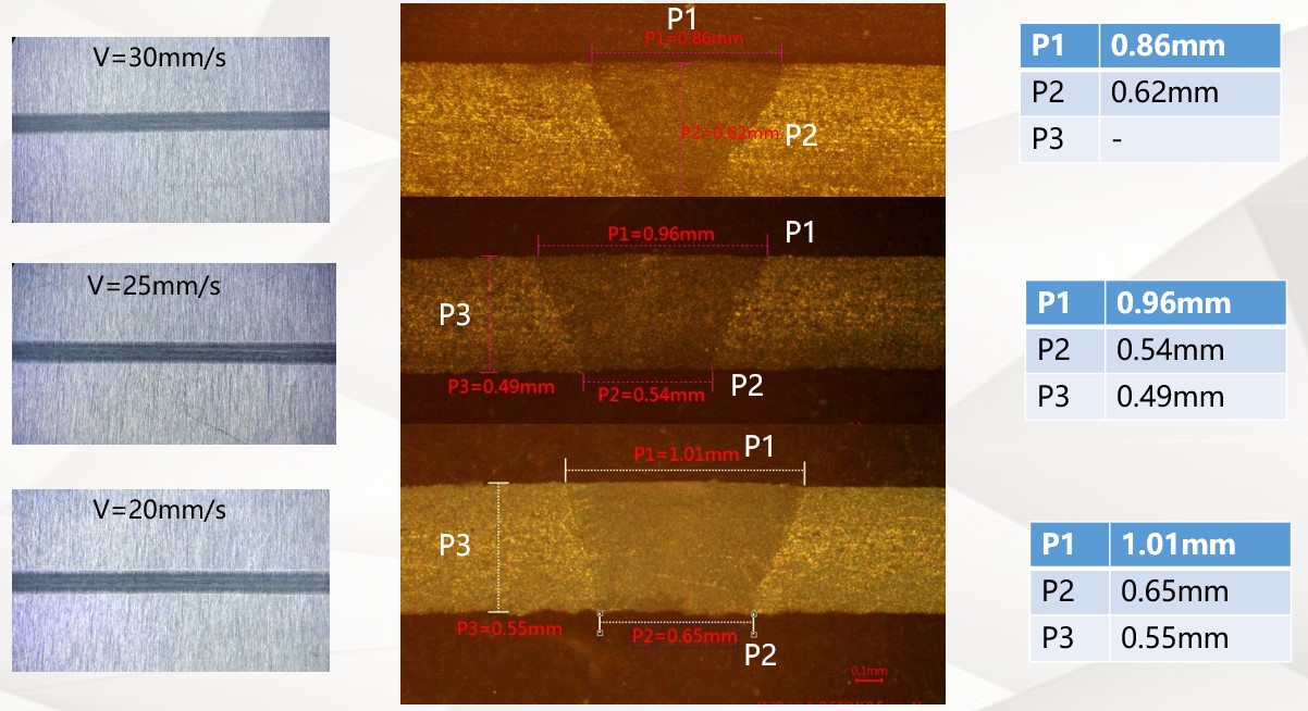 凯普林蓝光1000W系统见图8,长*宽*高:420mm*900mm*600mm,为了测试系统性能,我们选择了铜(T2), 不锈钢及铝合金(1060)作为焊接样品,从光纤端面到工件台上焦点的成像比例为1.5X,焊接过程中使用了He(或者Ar)气作为保护气氛,流量、焊接速度、功率、离焦量及对应的金相图见下图9-图13:整个焊接过程中,焊缝表面成型稳定,无任何飞溅,表面光滑;40X 显微镜下,焊缝内部未发现气孔。焊接测试数据资料及相关视频,可联系凯普林获取。