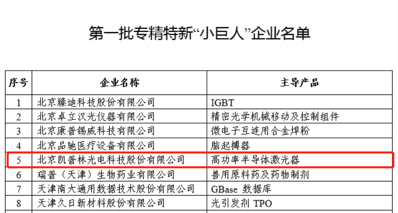 近日,工业和信息化部公布了“建议支持的国家级专精特新‘小巨人’企业公示名单(第一批第一年)”,凯普林光电成功入选!